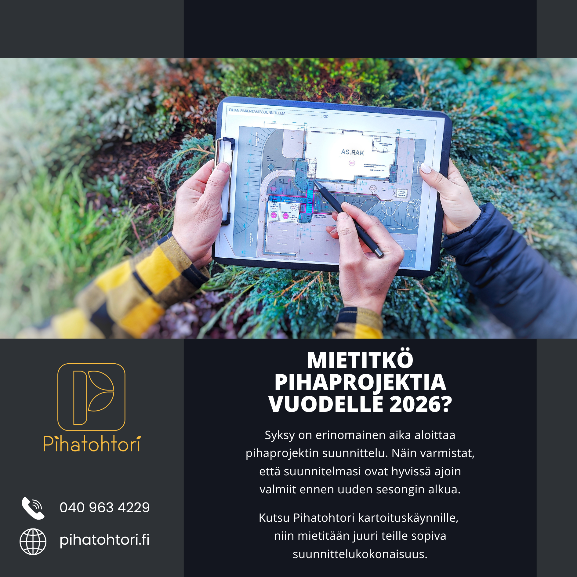 Mikäli mietit pihaprojektia vuodelle 2026, niin nyt on aika toimia. Kutsu Pihatohtori pihaasi kartoituskäynnille, niin mietitään mikä olisi juuri teille sopiva suunnittelukokonaisuus.